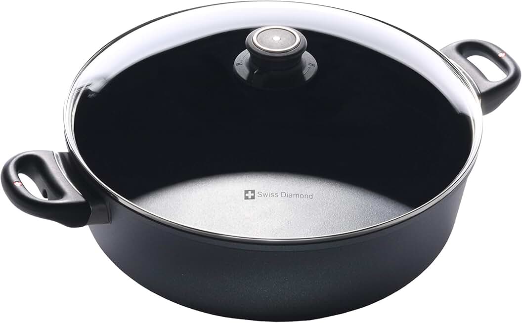Swiss Diamond 7.2 Quart Nonstick Braiser with Lid, Induction Compatible Nonstick Diamond Enforced 12.5 Inch Aluminum Braiser Includes Cover, Dishwasher and Oven Safe Cooking Pot