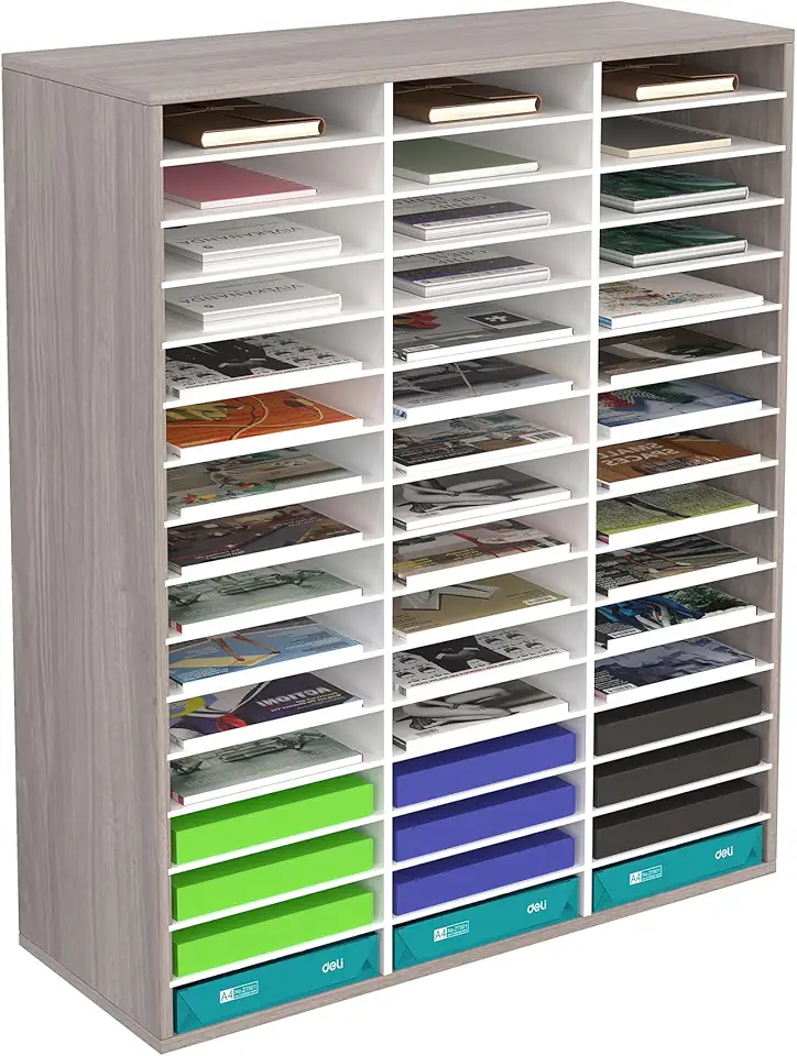 TQVAI Wooden Literature Organizer, 48 Slots File Organizer, Adjustable Mail Sorter, Paper Storage Organizer, Mailbox for Classroom, Office, Retro Grey/White
