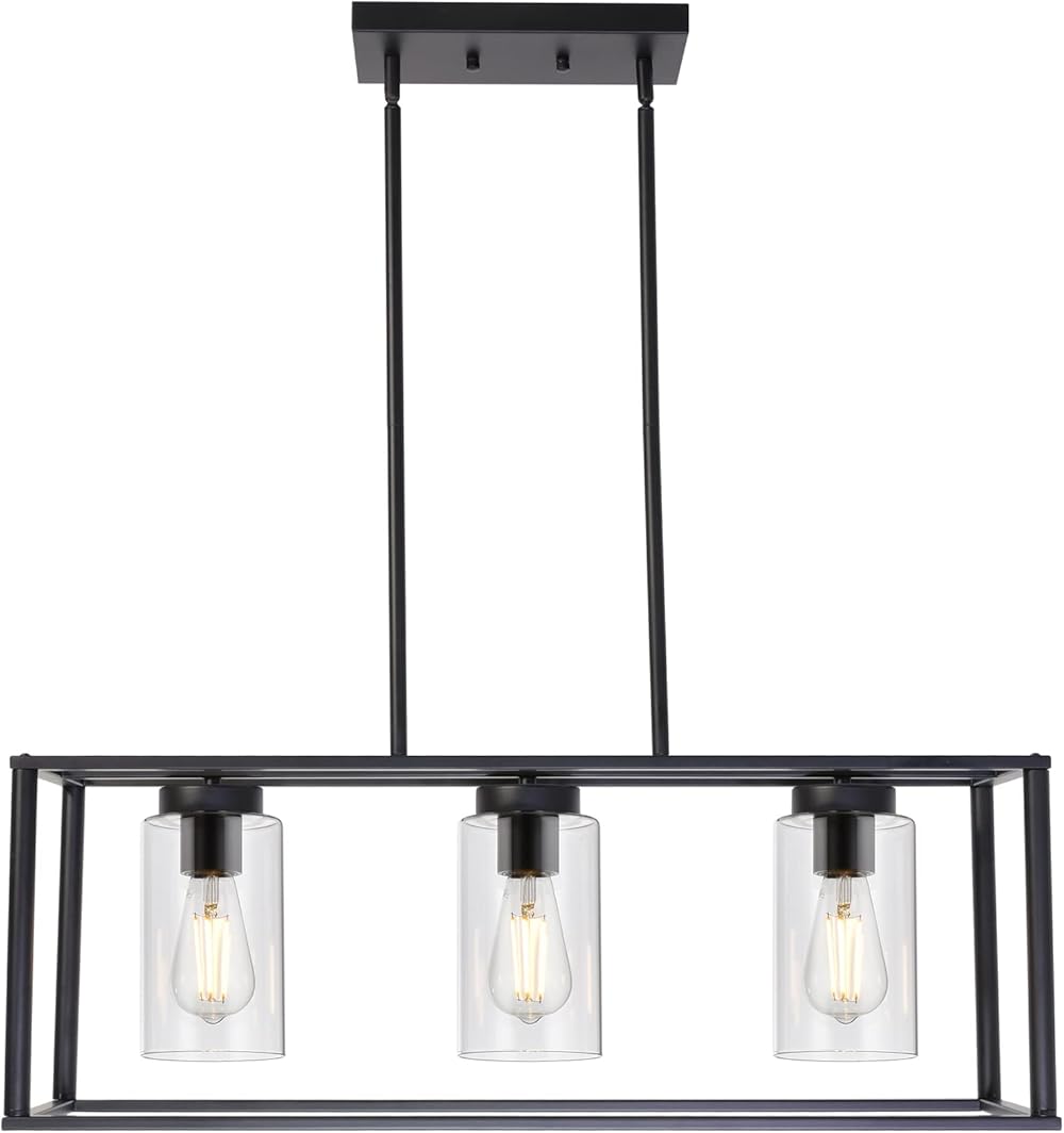 VINLUZ Contemporary Chandeliers Black 3 Light Modern Dining Room Lighting Fixtures Hanging, Kitchen Island Cage Linear Pendant Lights Farmhouse Flush Mount Ceiling Light with Glass Shade