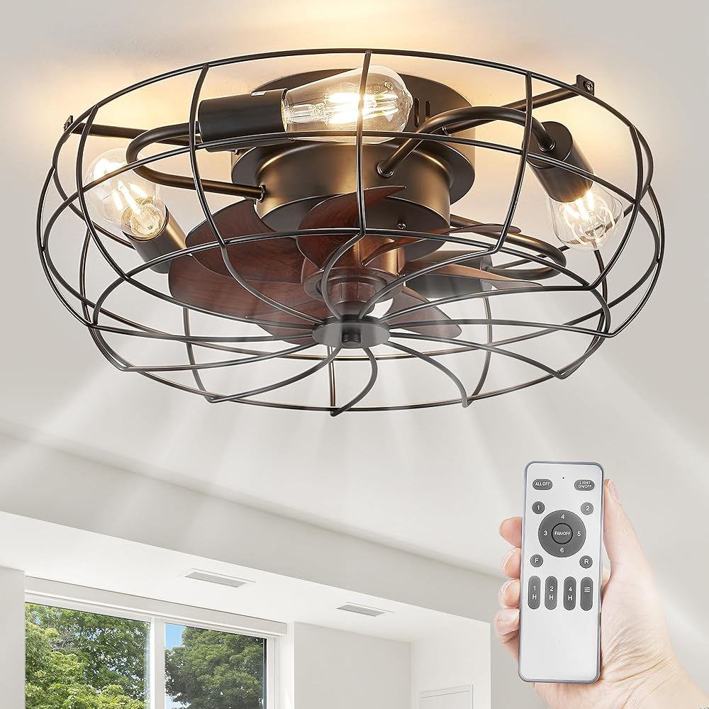 LEDIARY 20" Caged Ceiling Fans with Lights and Remote, Flush Mount Bladeless Ceiling Fan Low Profile, Small Farmhouse Industrial Enclosed Ceiling Fan with Light for Bedroom, Kitchen, Indoor