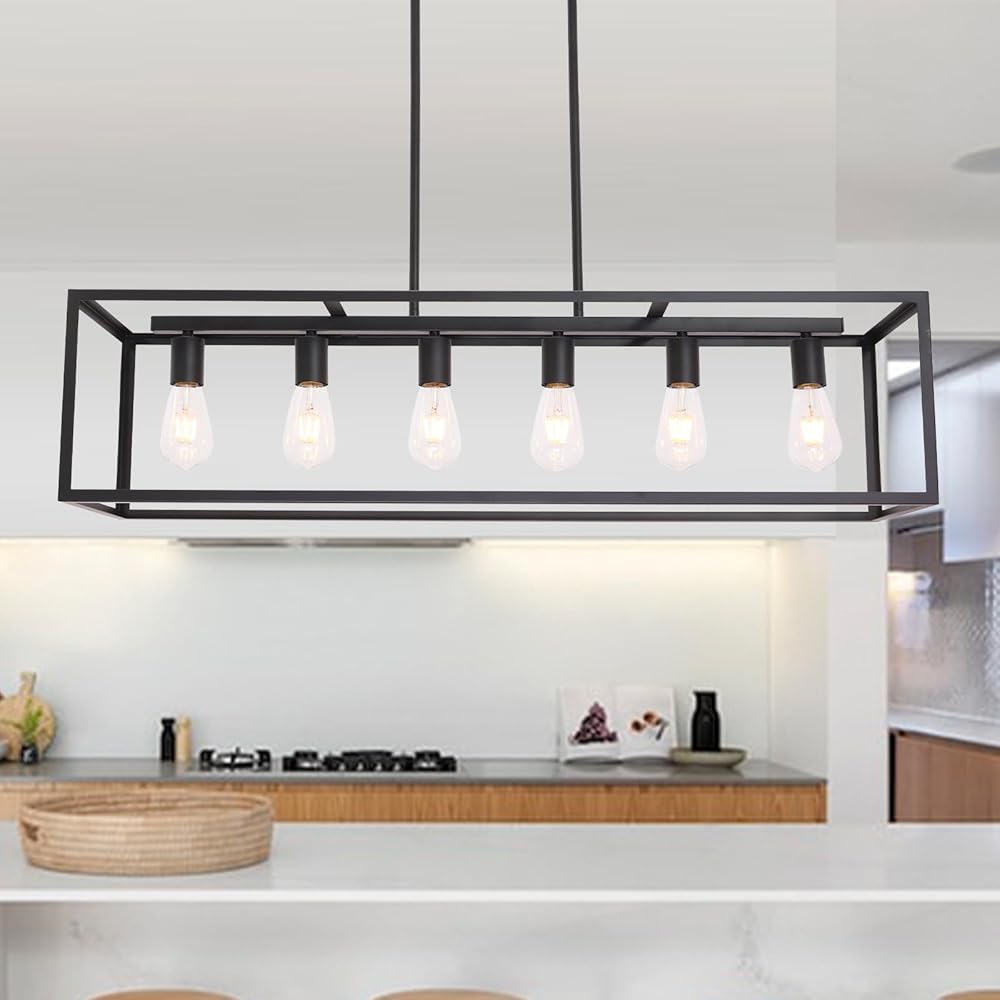 BONLICHT Black Rectangle Farmhouse Chandelier 6 Light Modern Dining Room Lighting Fixture Hanging Kitchen Island Pendant Light Industrial Metal Linear Cage Flush Mount Ceiling Light for Hallway Foyer