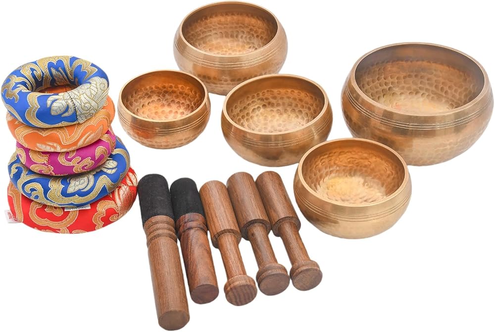 Authentic Tibetan Singing Bowl From 7 Planets, Lingam Design | Energy Meditation Sound Bowl, 6x1 inch Mallet & Cushion for Yoga, Deep Relaxation & Supporting Holistic Healing (5 Chakra Set)