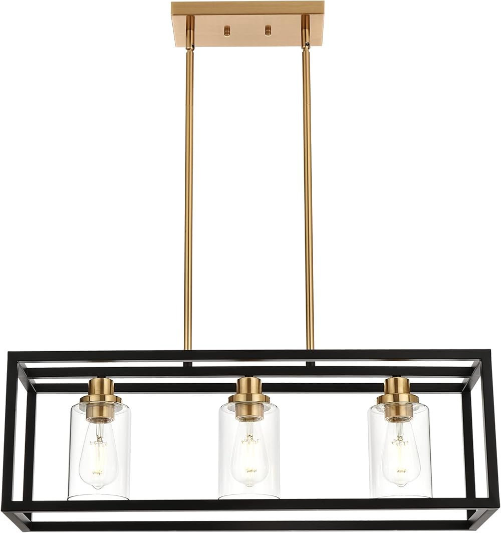 MELUCEE Dining Room Light, Island Lights for Kitchen Modern Chandeliers Rectangle Black 3 Lights, Linear Pendant Ceiling Lighting Fixture with Clear Glass Shade and Brass Socket, E26 Base