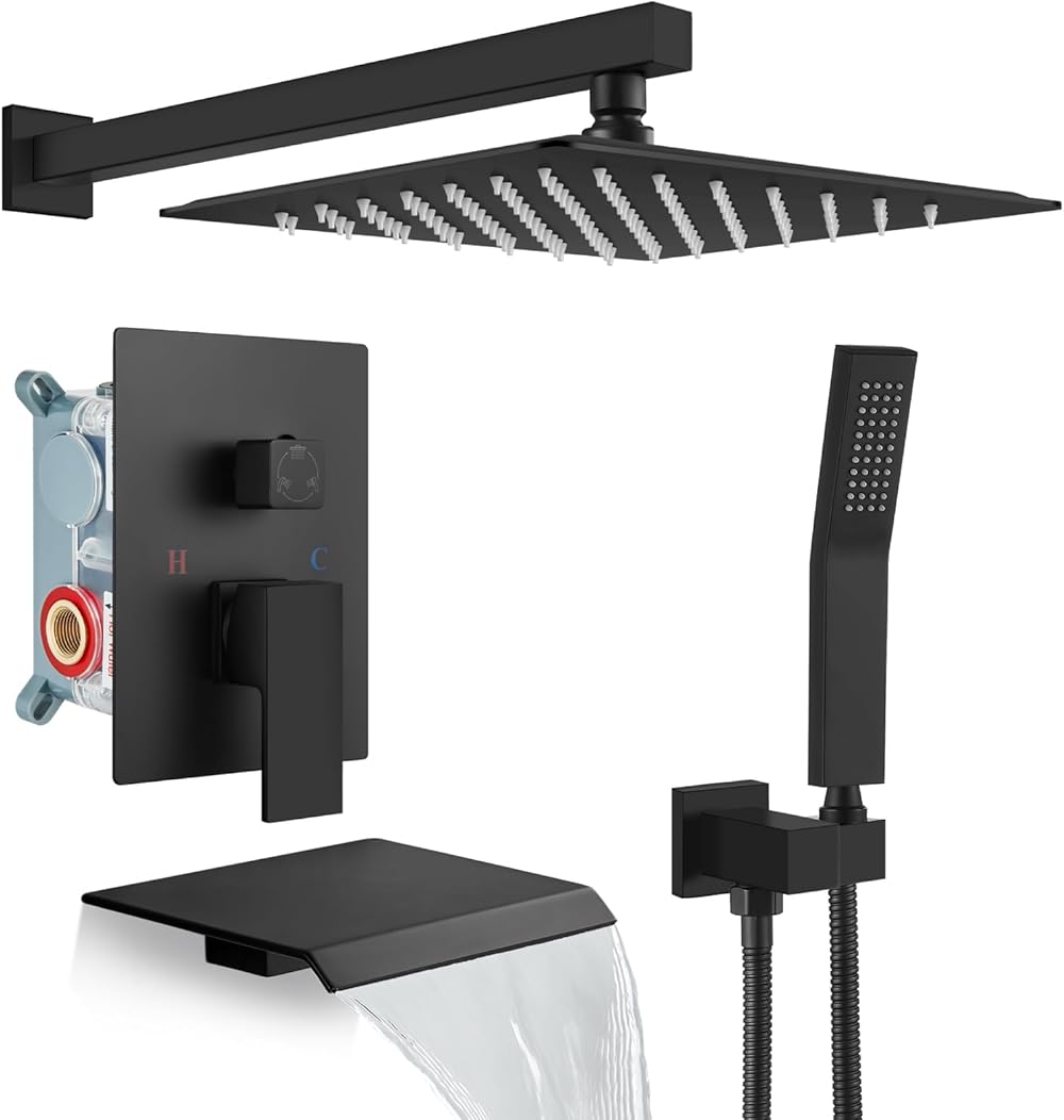 gotonovo 10'' Rain Shower Faucet System Rainfall Shower Head with Handheld Sprayer Waterfall Tub Spout Wall Mounted Mixer Combo Rough-in Valve and Trim Included 7.9 Inch Wide Spout Matte Black