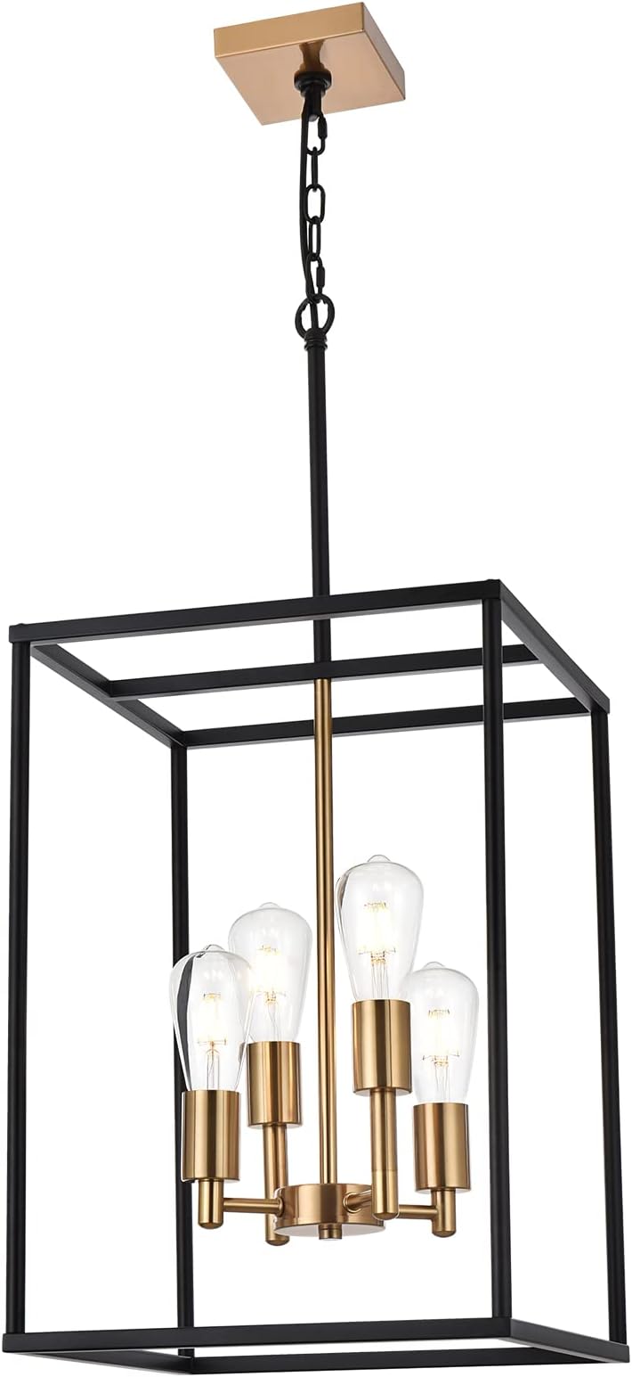 VINLUZ Retro 4 Light Large Farmhouse Chandelier Rustic Dining Room Lighting Fixtures Hanging in Black and Brushed Brass Finish Metal Square Cage Pendant Lighting for Kitchen Island