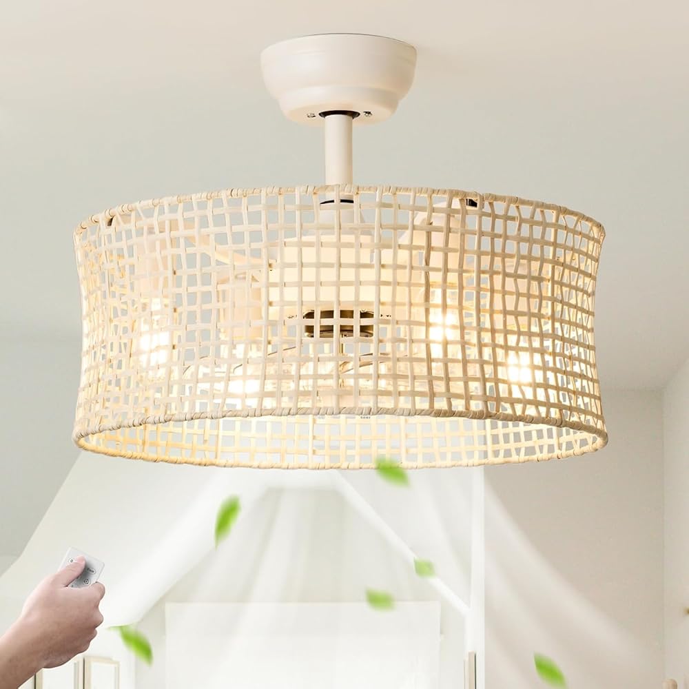 Boho Ceiling Fan with Light Flush Mount, 20inch Rattan Boho Ceiling Fan with Light and Remote, Boho Fandelier Ceiling Fan with Light for Bedroom, Dining Room, Living Room, Nursery