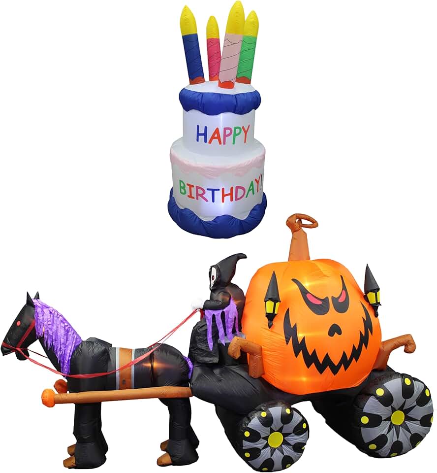 TWO BIRTHDAY AND HALLOWEEN PARTY DECORATIONS BUNDLE, Includes 6 Foot Tall Inflatable Happy Birthday Cake with Candles & 11.5 Foot Long Inflatable Grim Reaper Driving Pumpkin Carriage Blowup with Light