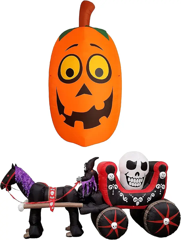 TWO HALLOWEEN PARTY DECORATIONS BUNDLE, Includes 10 Foot Tall Inflatable Silly Funny Cute Pumpkin, and 12 Foot Long Inflatable Carriage with Skeleton Ghost Skull Outdoor Indoor Blowup with Lights
